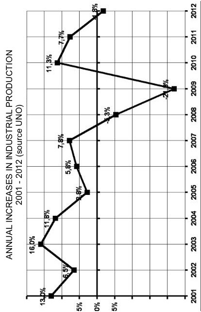 After having made a strong recovery in 2010 and 2011, the second international recession caused a new blip in industrial production in 2012 and in 2013, with a fall in profits for businesses and banks. After the United States emerged from the recession at the end of 2013, with the FED announcing a progressive arrest of ‘quantitative easing’ (from September 2012 the FED bought up 85 billion dollars in mortgages and treasury bonds each month to keep the rates of interest low, making money cheaper and more available) and after the announcement of the economic recovery of the European Union, capital abandoned the emerging countries, the BRICS (Brazil, Russia, India, China and South Africa) and returned to North America and Europe, causing the currencies of the former countries to sink, and provoking recession there. Ukraine is suffering from this tendency as well.
