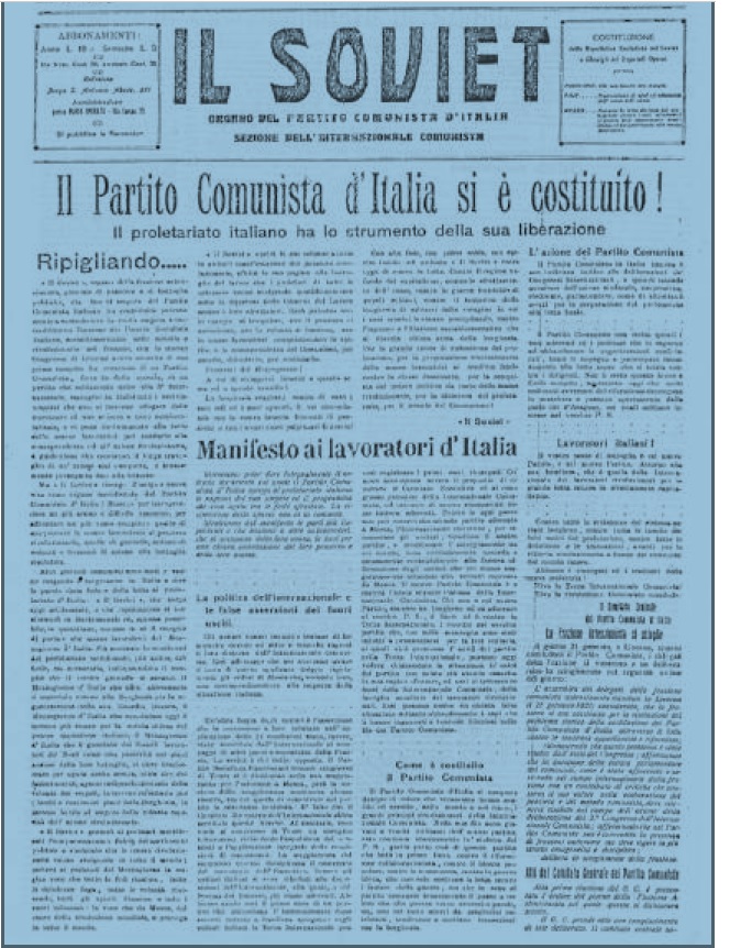 Manifesto to the Workers of Italy. Il Soviet had been the newspaper of the left wing of the Italian Socialist Party. After Livorno it became a newspaper of the Communist Party of Italy. This issue from February 6, 1921 announces the foundation of the party.