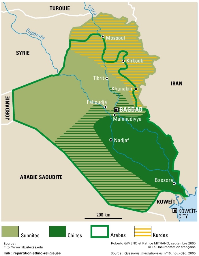 Nonostante la immensa ricchezza petrolifera, lo Stato iracheno è debole e paralizzato dallo stato di guerra fra le comunità e fra partiti politici. Il primo ministro sciita Nuri al Maliki si mantiene ormai tramite una feroce dittatura, in particolare contro la minoranza sunnita non curda. Questa rappresenta il 20% della popolazione ed è stanziata soprattutto nell’ovest del paese; gli sciiti sono il 60%, e vivono in maggioranza nell’est e nel centro, le regioni più povere. Il 20% sono curdi, in prevalenza sunniti, ed abitano nel nord, nella regione autonoma del Kurdistan iracheno; infine 800.000 sono i cristiani caldei e nestoriani di etnia assira, armena o latina.