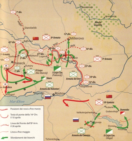 Lo spiegamento delle forze sovietiche a nord-est era posizionato con il gruppo di Koženikov di 20.000 uomini, la futura XIII Armata, che si agganciava a nord di Millerovo al fianco destro della VIII Armata di 27.000 uomini, comandata da Tuchačevskij, appena trasferito dal fronte orientale. Questa armata controllava un esteso fronte da Millerovo fino a Vesenskaja. Qui la IX Armata di 28mila uomini era posizionata verso est dove con la X Armata di Egorov con 23.000 uomini controllavano tutta l’area fino al Volga a nord di Caricyn.