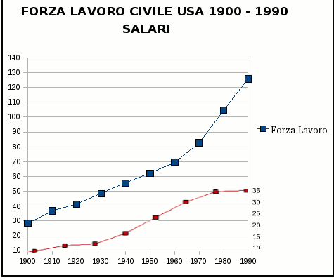 Grafici n. 3 e 4 - Forza lavoro civile; Salari; Disoccupati 1900-1990